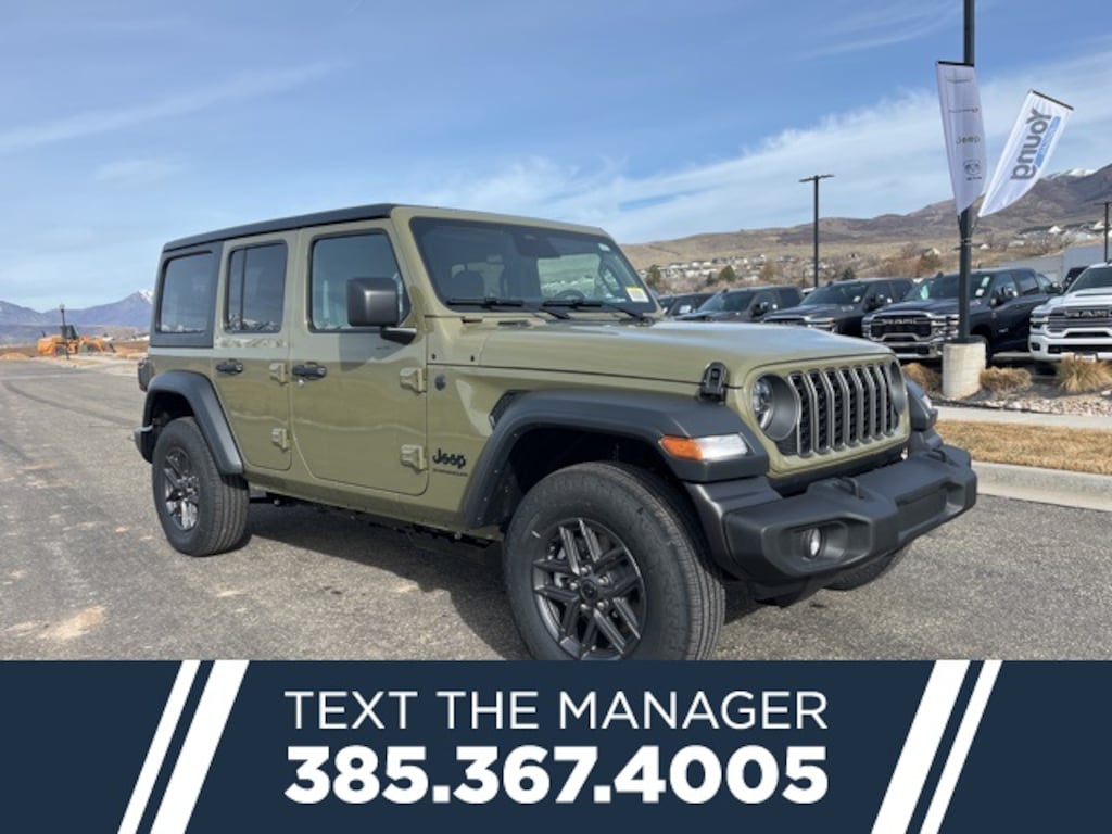 2026 Jeep Wrangler 41 Sport S 4WD 8-Speed Automatic 3.6L V6 24V VVT To Qualify for the Young Dodge Morgan Best Price, customer must use Young Dodge Dealer Financing. Dealer is to arrange Financing. Cannot be combined with any other offers or discounts. Not all buyers will qualify for available offers, incentives or discounts based on Credit, Trade, Model, Zip Code, etc. Young Dodge Best Price does not include Taxes, States Fees, Registration Fees, Dealer Fees, or any Dealer Installed Accessories. Not all Customer will qualify. Contact dealer for details. Price includes: $1000 - 2026 National Stellantis Loyalty Bonus Cash . Exp. 03/02/2026 $2,000 Neighborhood Discount: Neighborhood Discount applies to the state of Utah, Uintah County, and Evanston, WY. See dealership for complete details. $2,000 Finance Discount: Must finance through Young Chrysler Jeep Dodge Ram of Layton or one of their approved lenders to qualify.