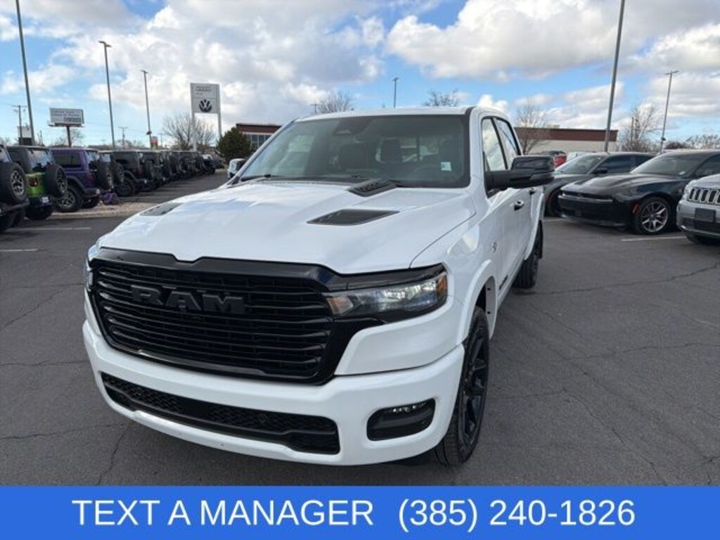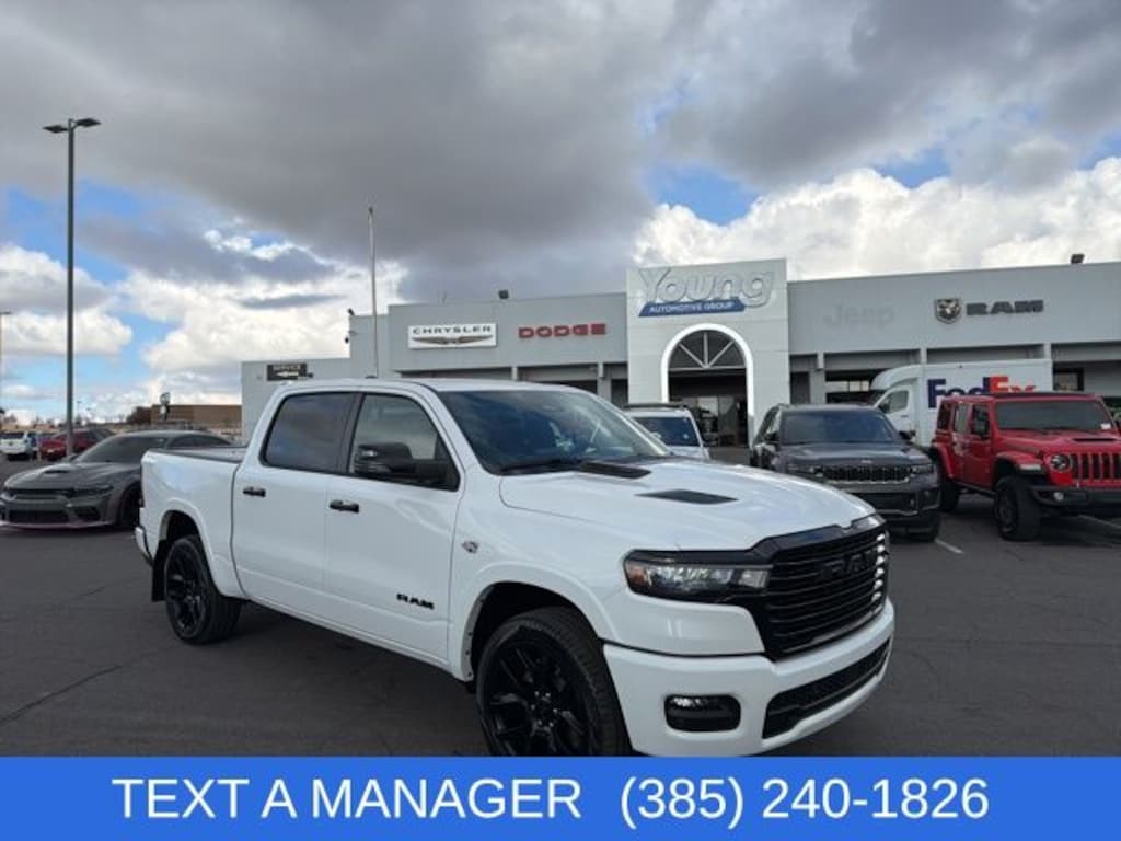 2026 Ram 1500 Laramie Bright White Clearcoat HEMI 5.7L V8 Multi Displacement VVT eTorque 8-Speed Automatic 4WD Price includes: $1000 - 2026 National Bonus Cash . Exp. 03/31/2026 $3500 - 2026 National Retail Consumer Cash . Exp. 03/31/2026 $2,000 Finance Discount: Must finance through Young Chrysler Jeep Dodge Ram of Layton or one of their approved lenders to qualify. $2,000 Neighborhood Discount: Neighborhood Discount applies to the state of Utah, Uintah County, and Evanston, WY. See dealership for complete details.